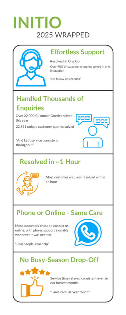 We also made sure you could reach us in whatever way suits you best. The majority of our customers chose to contact us online – whether by email, live chat, or through their initio dashboard – and they got the same friendly, professional care as if they’d called us on the phone. Of course, whenever a phone call was preferred or needed, we were right there too. Real people, real help, every time. We know sometimes you just want to hear a reassuring voice on the other end of the line, and our phone support team was ready whenever those moments came.