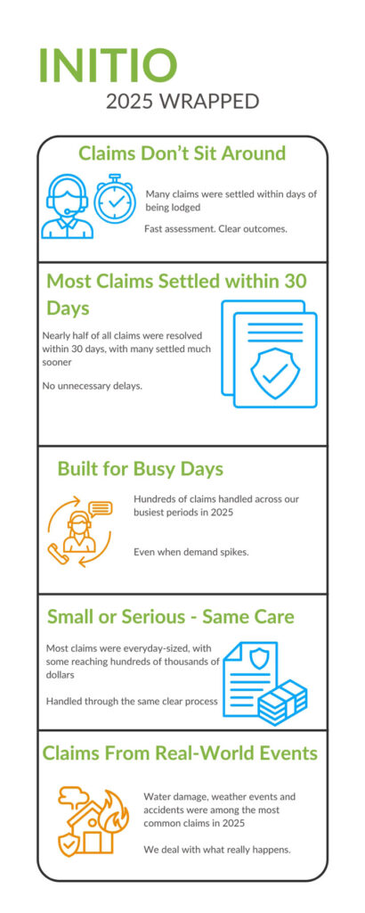 As 2025 comes to a close, we want to take a moment to reflect on some of the ways we’ve helped our customers this year. It’s been a year of quick claims and responsive support at initio – all driven by our core values of customer satisfaction, speed, and making insurance easy. From fast claim resolutions to lightning-quick answers on our support lines, 2025 showed what our team and technology can do to take care of you when it matters most.